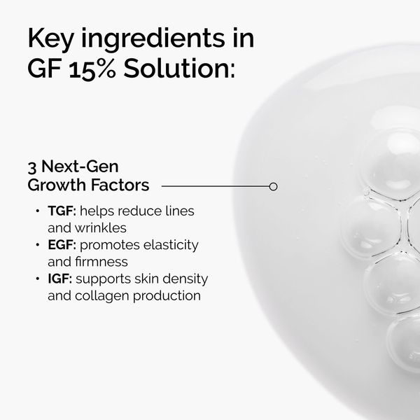 Skin naturally contains different types of growth factors, including EGF, IGF, and TGF. Growth factors for skin work to signal its natural repair mechanisms. Over time and with age, skin’s natural levels of growth factors declines, contributing to the appearance of visible signs of aging. GF 15% Solution contains a 15% solution of plant-based biomimetic EGF, TGF, and IGF peptides. These offer a triple-action approach for short, mid and long-term skin renewal benefits.